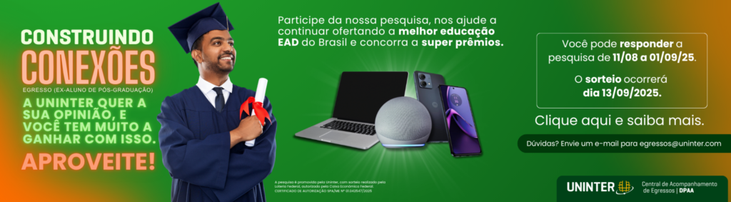 O Centro Universitário Internacional – UNINTER, por meio da Central de Acompanhamento de Egressos, convida você, formado(a) em um de nossos cursos de pós-graduação, a participar da Pesquisa de Egressos 2025.